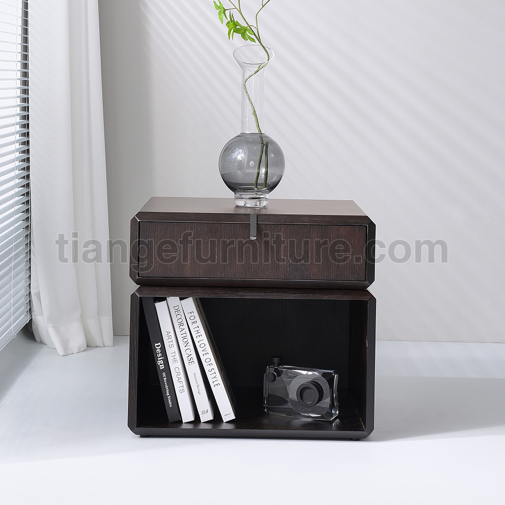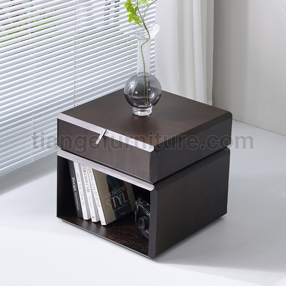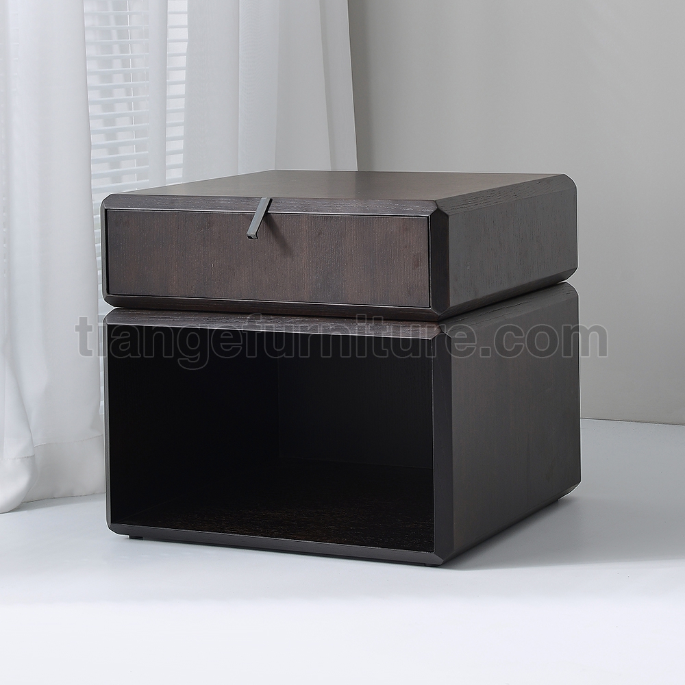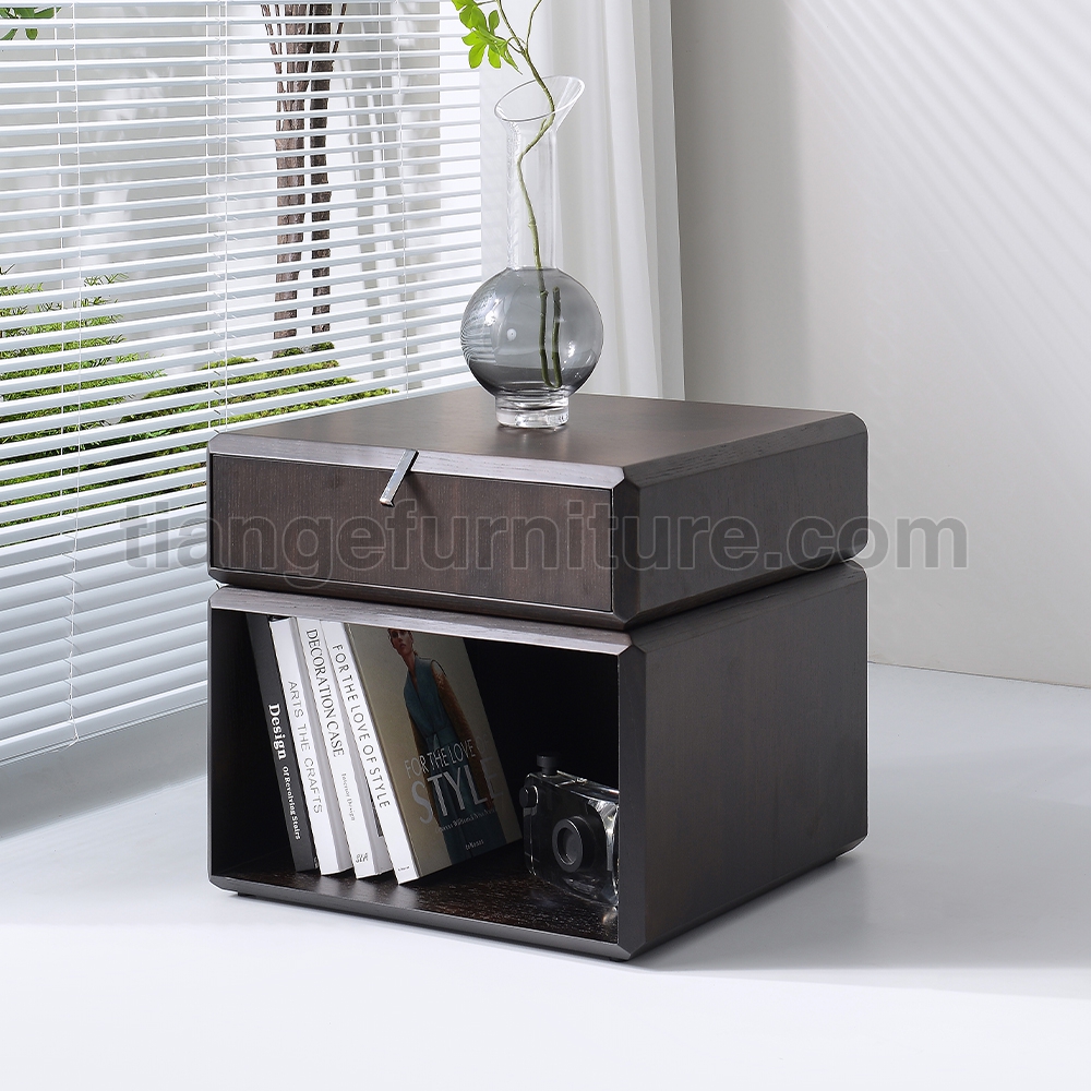 This simple and elegant bedside table adds a touch of luxury and elegance to your bedroom. Made of smoked solid wood, the top drawer can rotate for easy access to items, and the bottom has an open storage area.