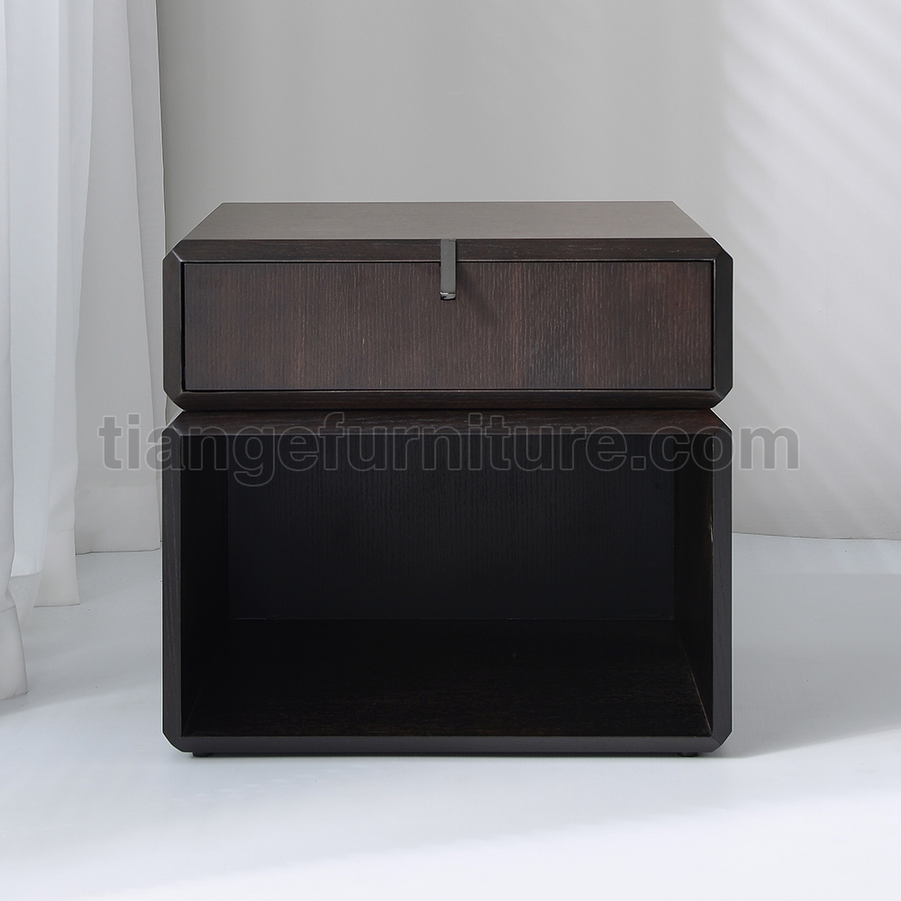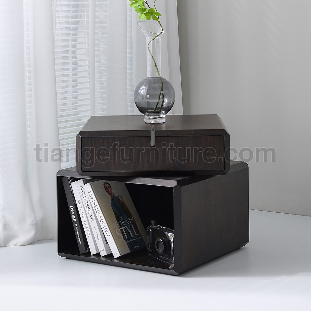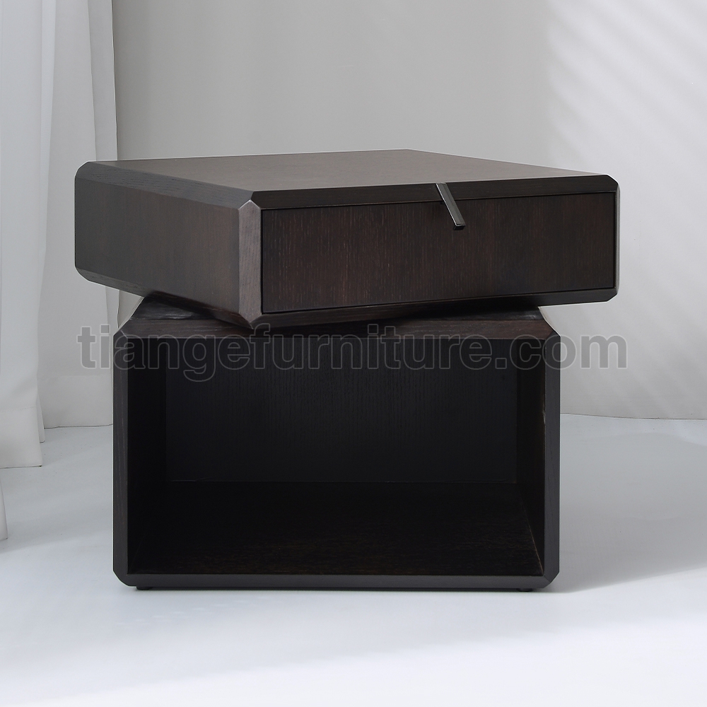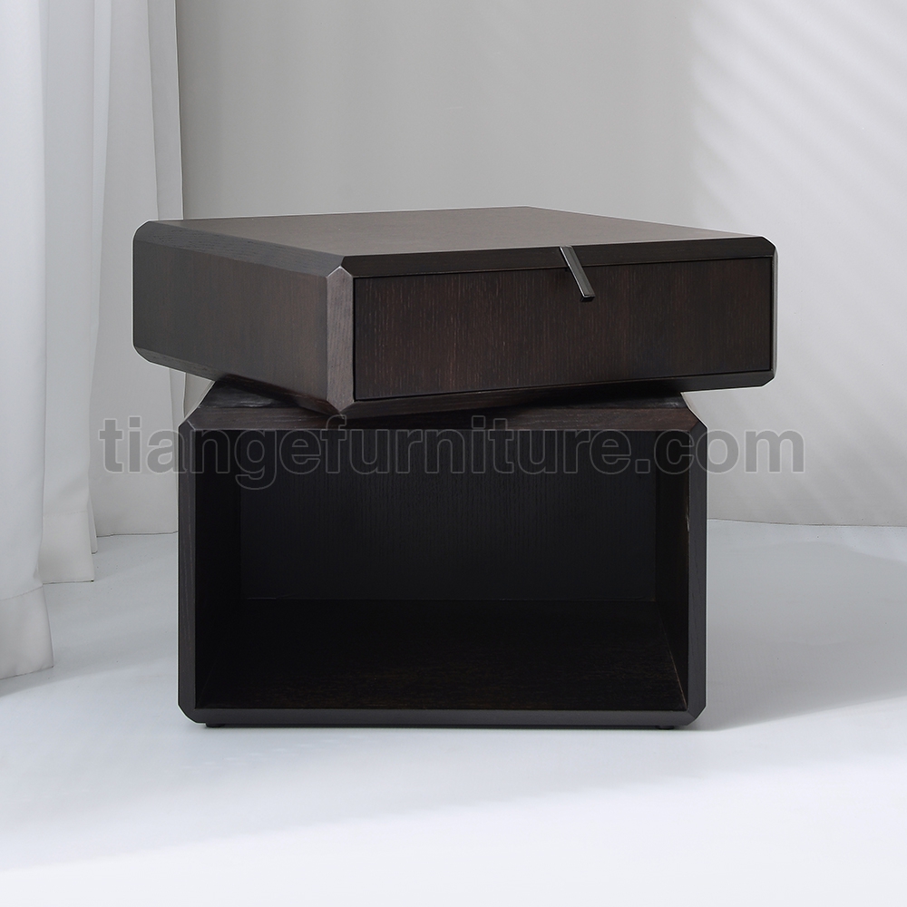 This simple and elegant bedside table adds a touch of luxury and elegance to your bedroom. Made of smoked solid wood, the top drawer can rotate for easy access to items, and the bottom has an open storage area.