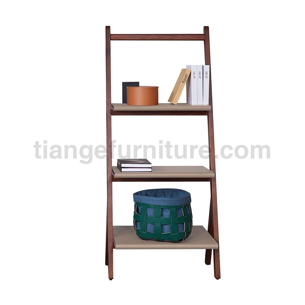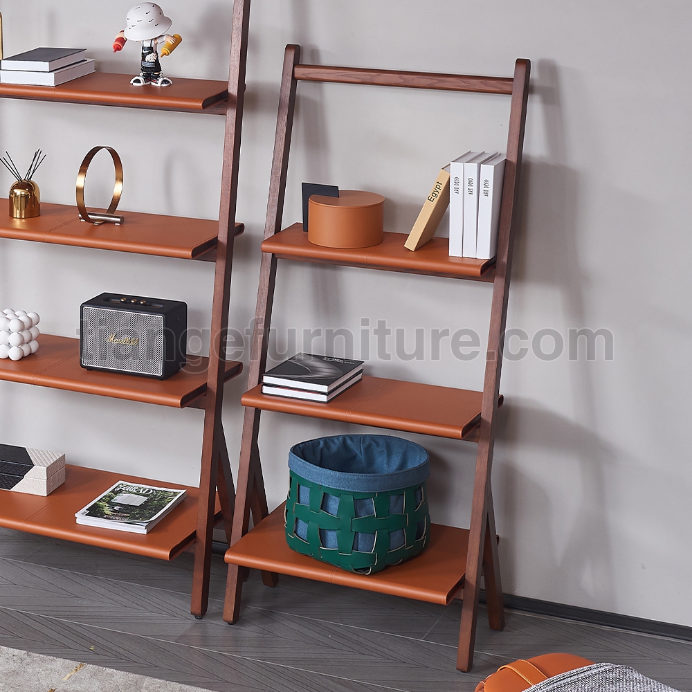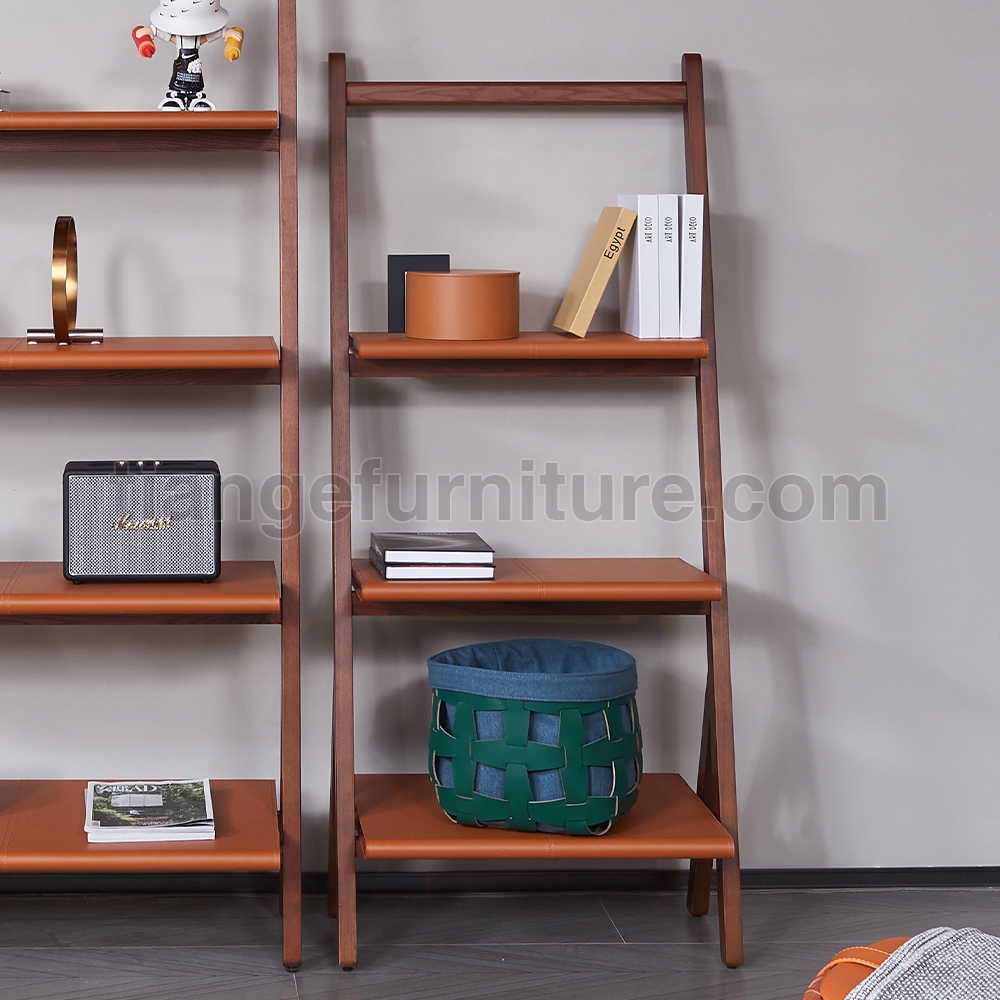 The Ren bookcase is a graphical weave of lines. The two lateral uprights, slightly inclined, support the birch plywood shelves, upholstered in saddle-leather with a Canaletto walnut veneer on the sides. The upper crosspiece is fixed to the wall using metal hooks with a natural brass finish. The bookcase comes in a low version with a round multi-purpose tray upholstered in saddle-leather hanging from the upper crosspiece, and in a tall version. They differ from each other in terms of height, width and number of shelves. Both variants can be completed with bookends in brushed steel with a natural brass finish