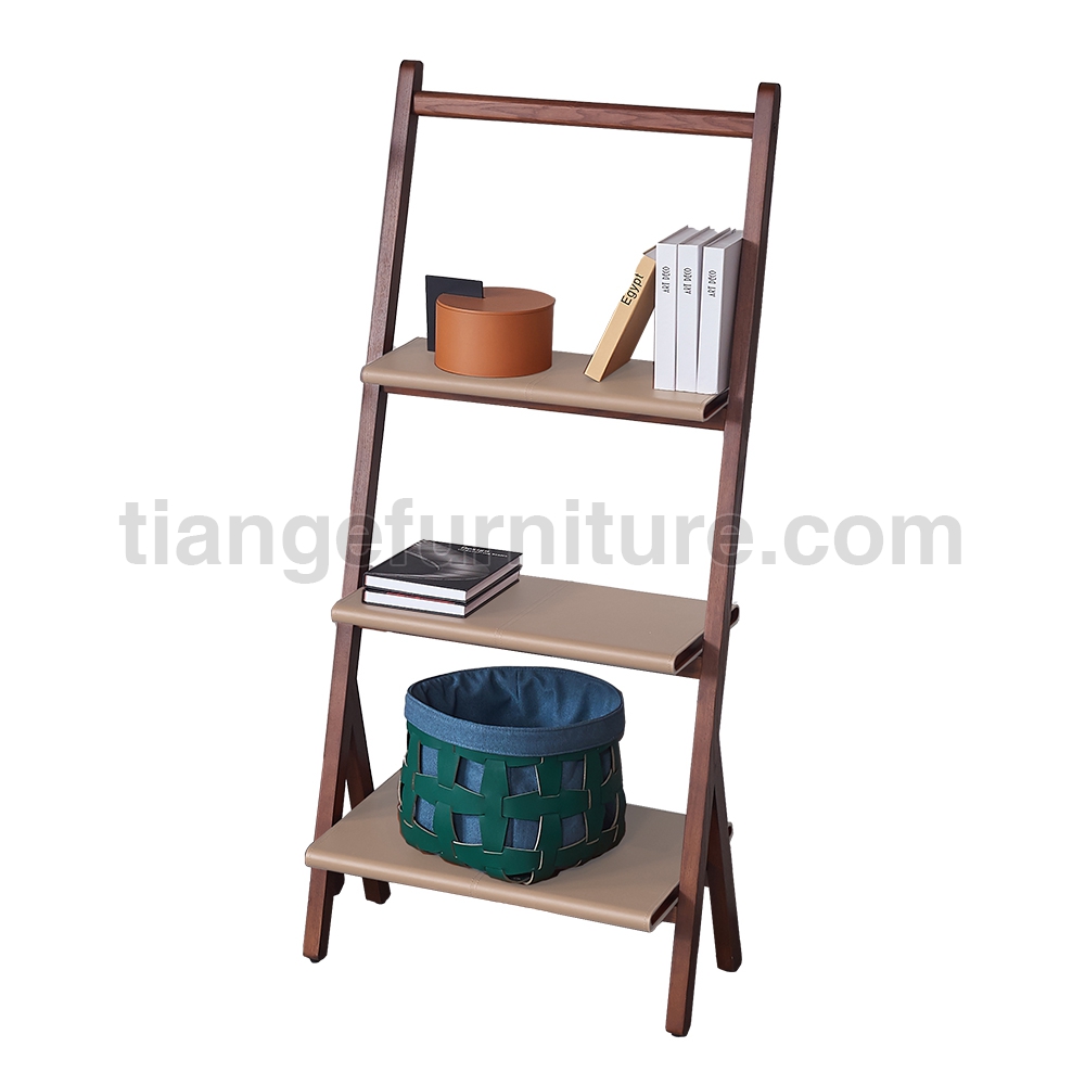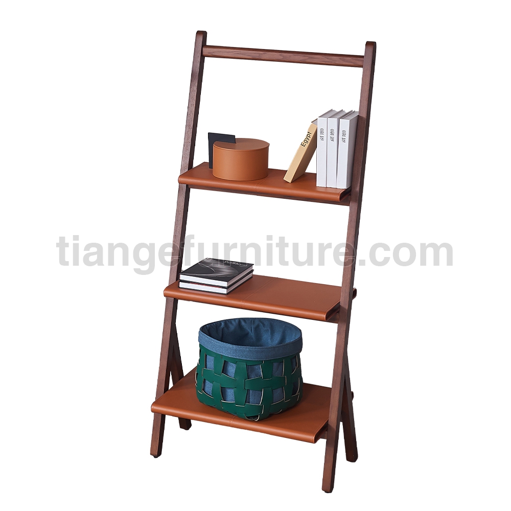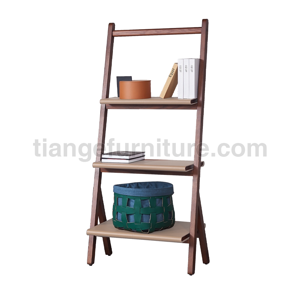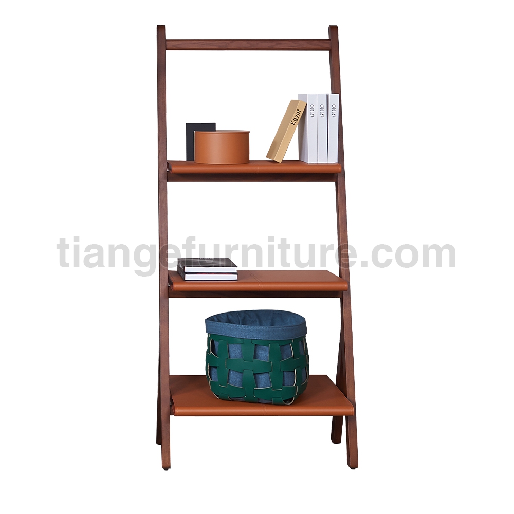 The Ren bookcase is a graphical weave of lines. The two lateral uprights, slightly inclined, support the birch plywood shelves, upholstered in saddle-leather with a Canaletto walnut veneer on the sides. The upper crosspiece is fixed to the wall using metal hooks with a natural brass finish. The bookcase comes in a low version with a round multi-purpose tray upholstered in saddle-leather hanging from the upper crosspiece, and in a tall version. They differ from each other in terms of height, width and number of shelves. Both variants can be completed with bookends in brushed steel with a natural brass finish