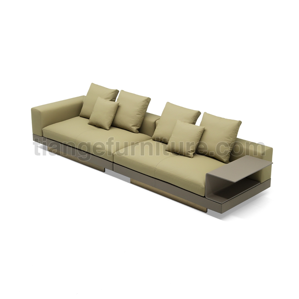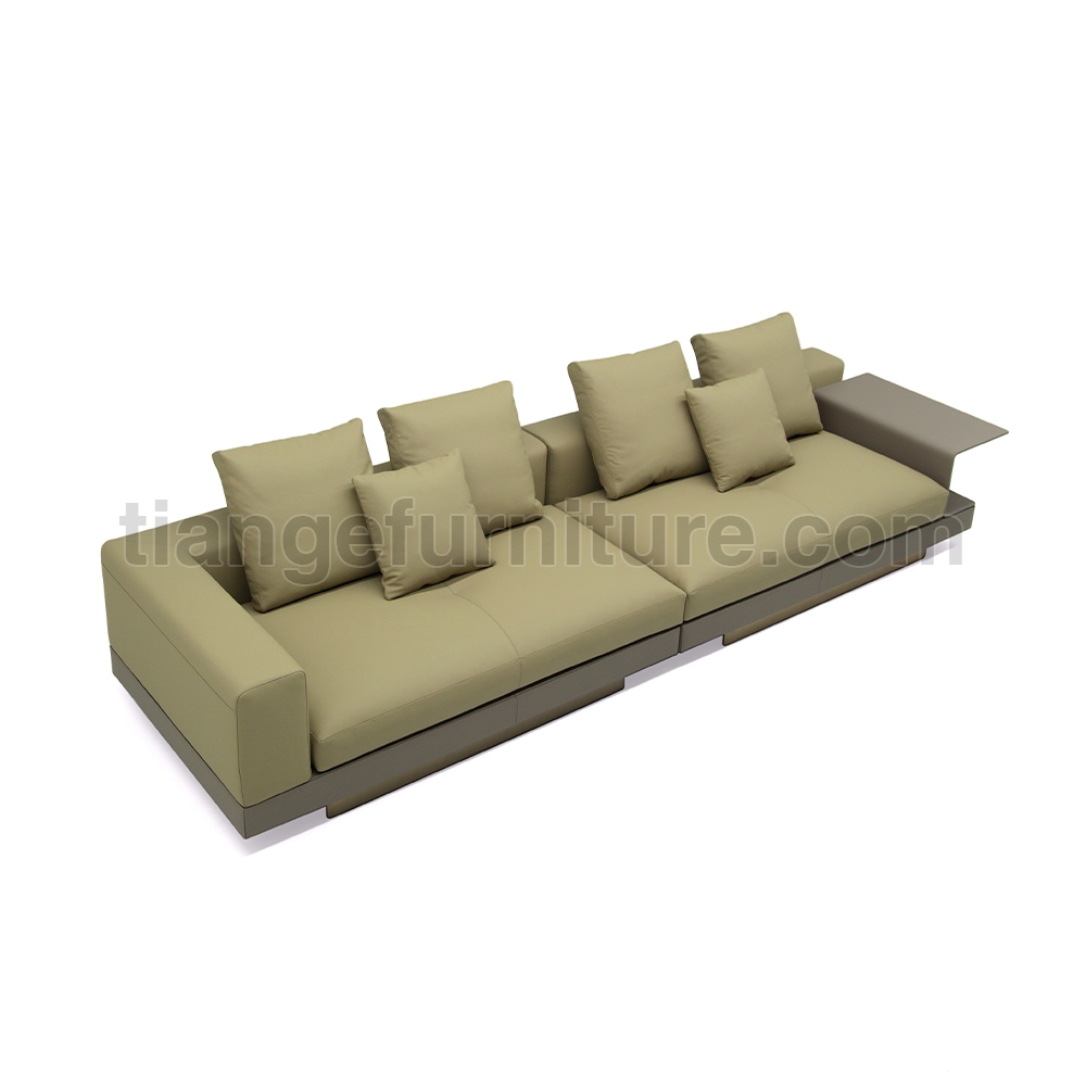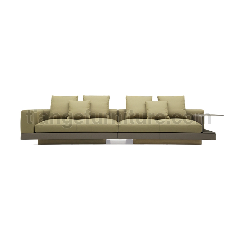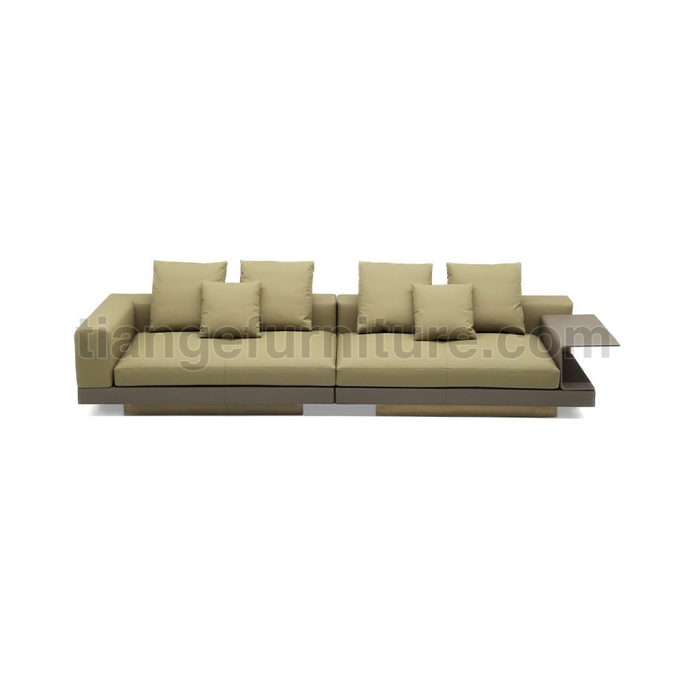 The structural base is raised from the ground on thin blades in extruded aluminium in a Brandy polished varnished finish, positioned at the front, giving the sofa an appealing and airy look, and recalling the metal parts of trunks and suitcases.