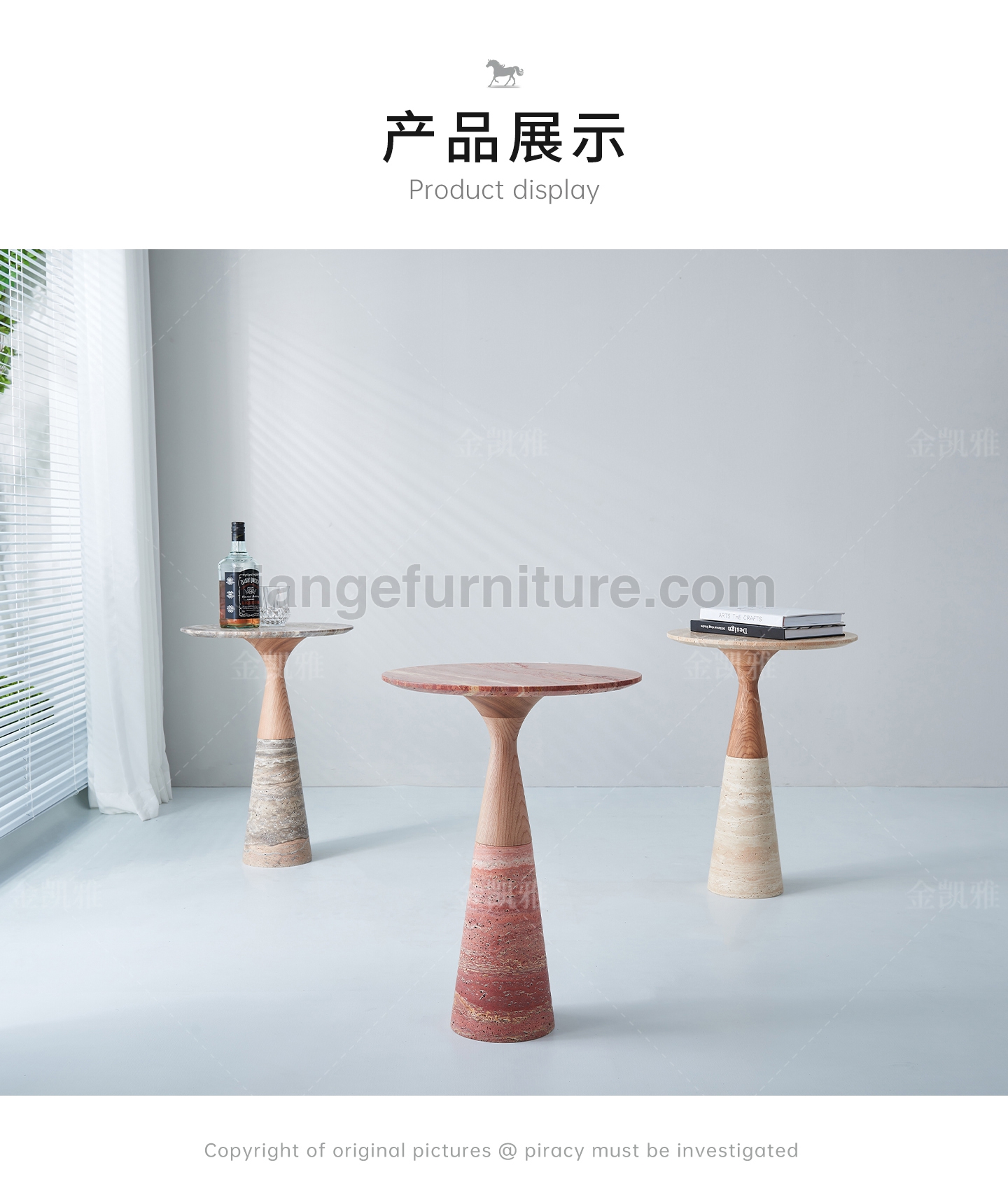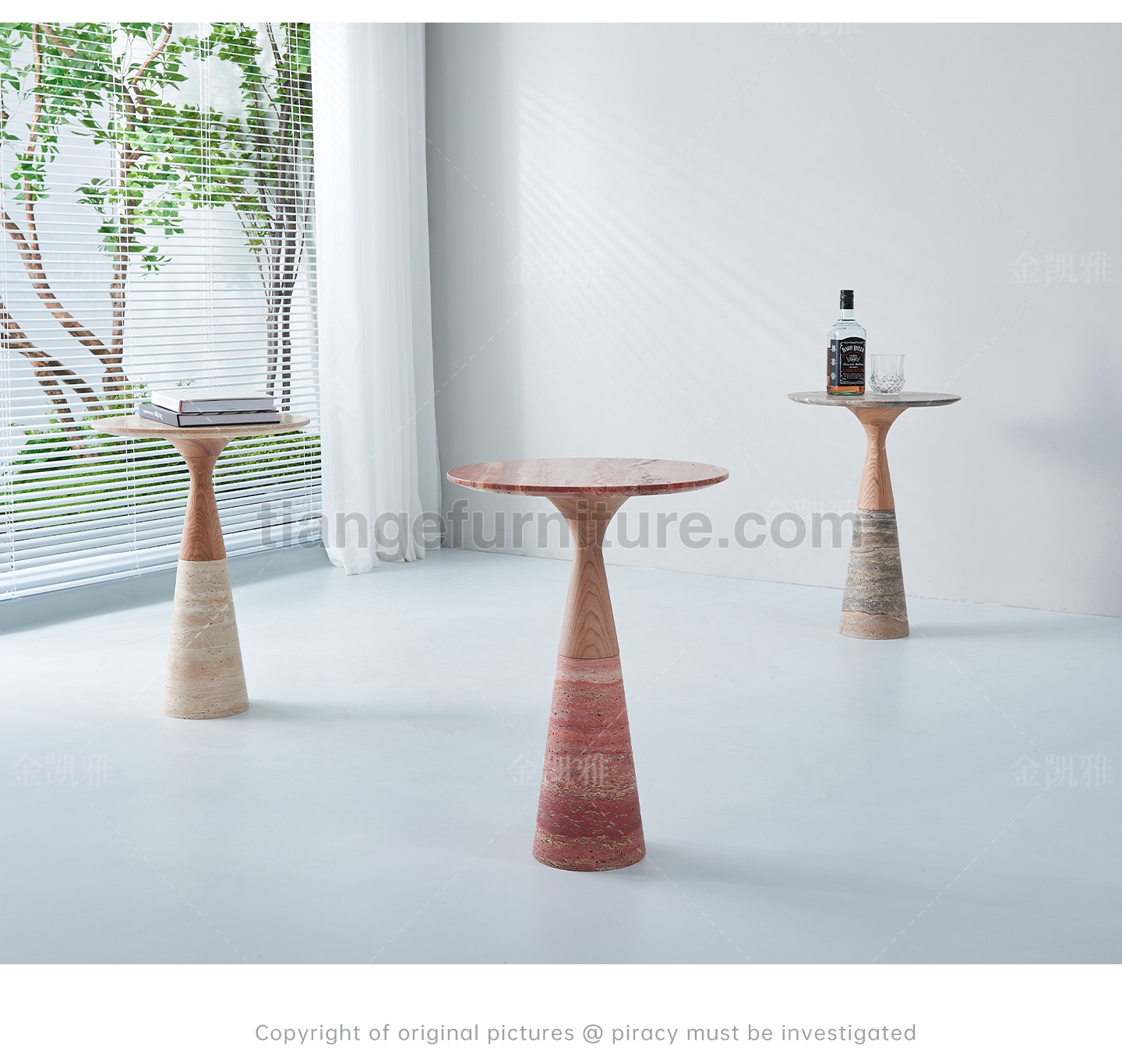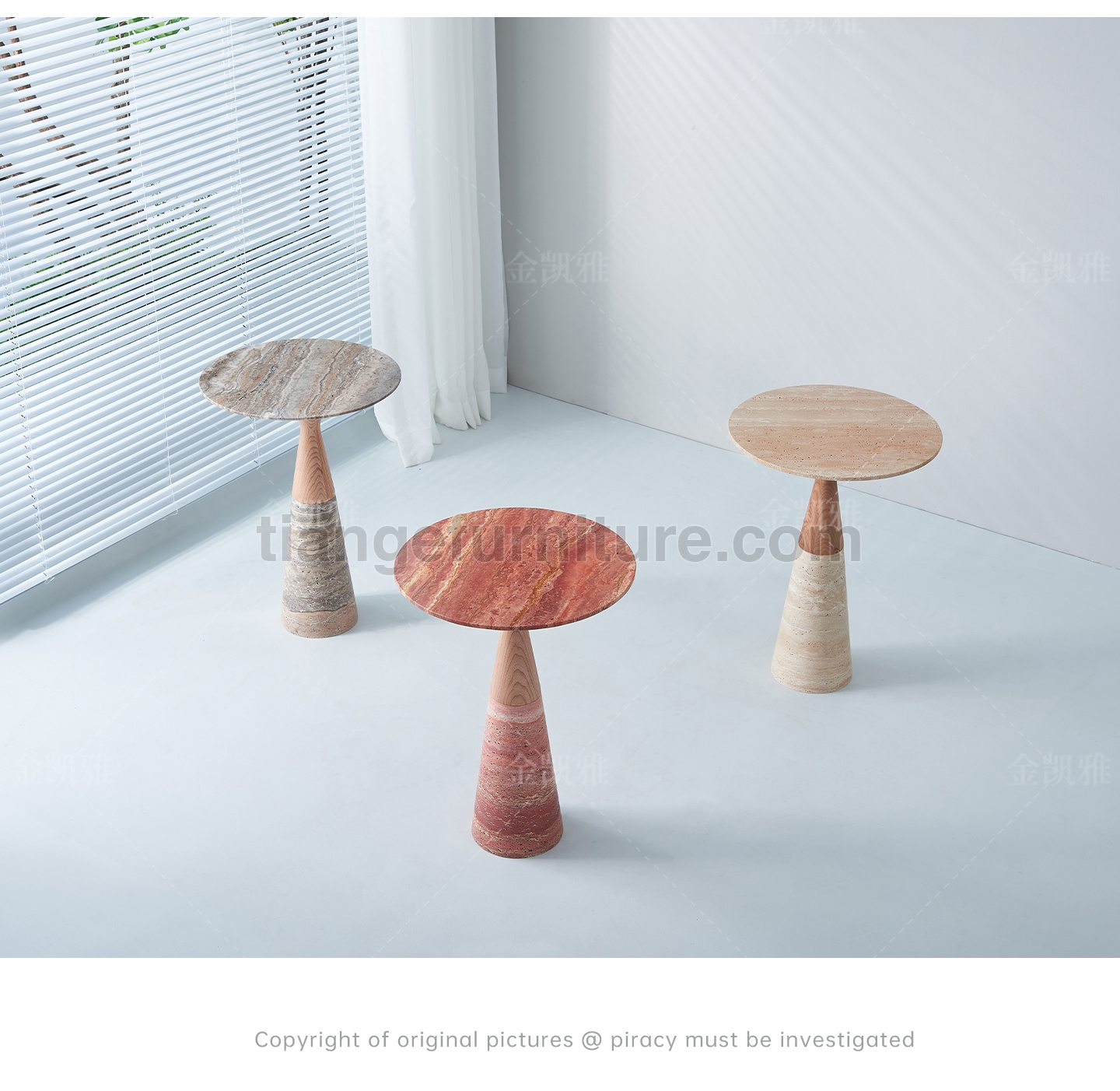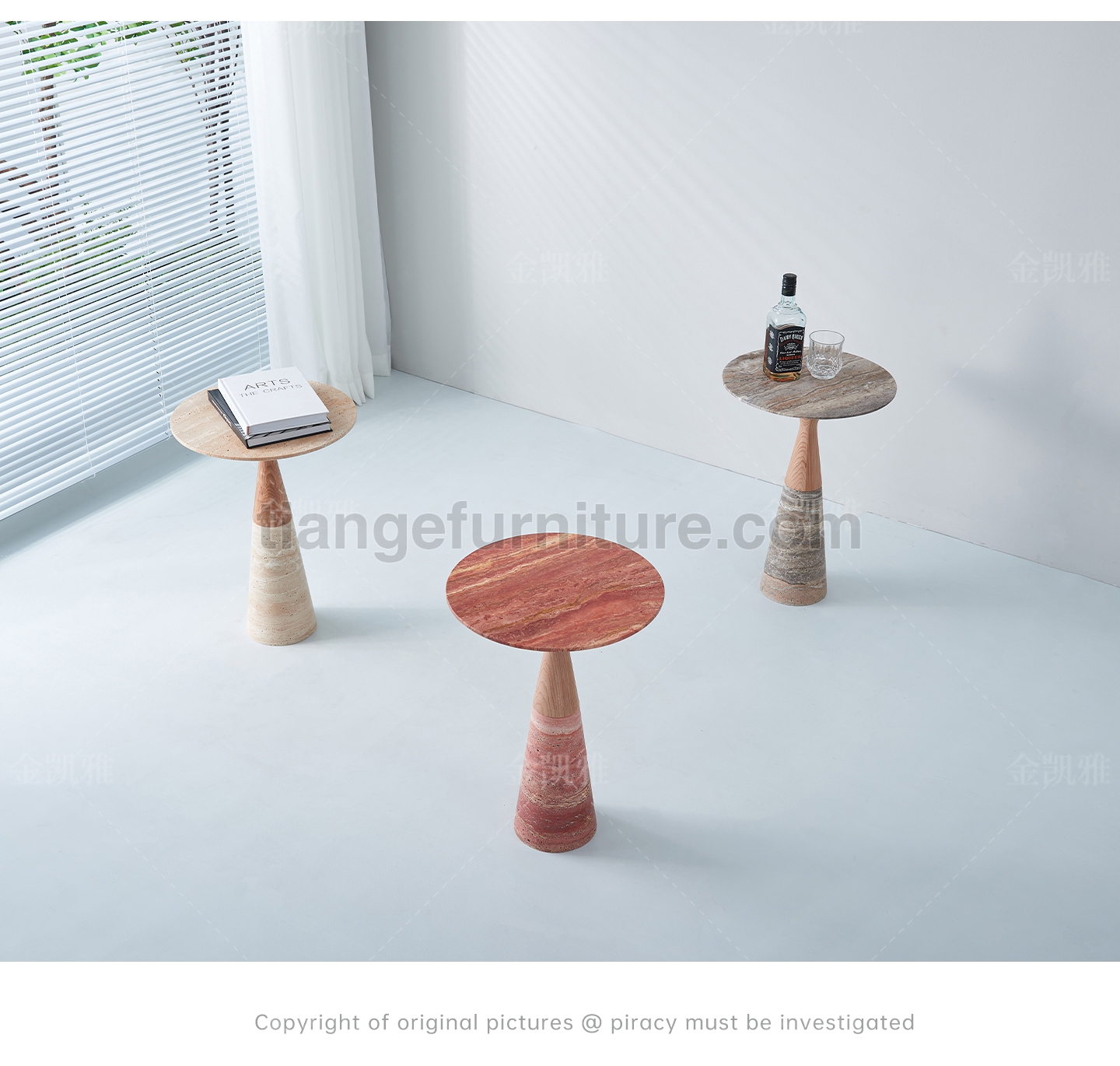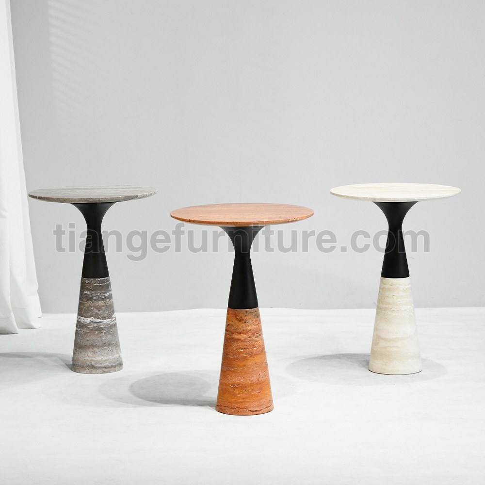 Side tables from Alinea Design Objects,Designed by Leo Aerts A group of coffee tables in various heights and sizes that combine perfectly with each other. The base consists of a flowing curve that runs from the base to the edge of the tabletop. A play of different materials allows for an infinite variety of finishes. To showcase the marble in its most expressive qualities, its surface can be finished in various ways (polished, honed, brushed, rasped, sandblasted, and brushed). The basic collection includes eight different marble types and various dimensions. Upon request, this creation can be manufactured in almost any marble type and size.