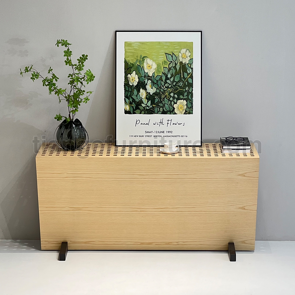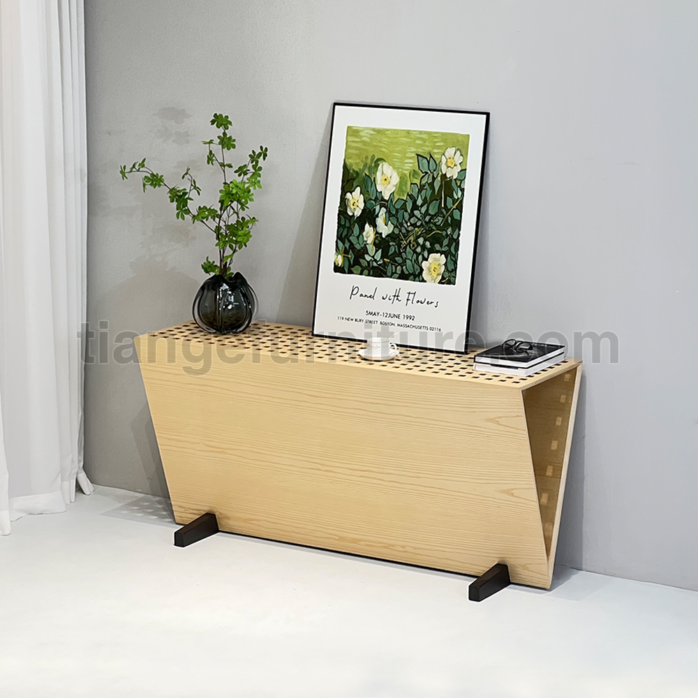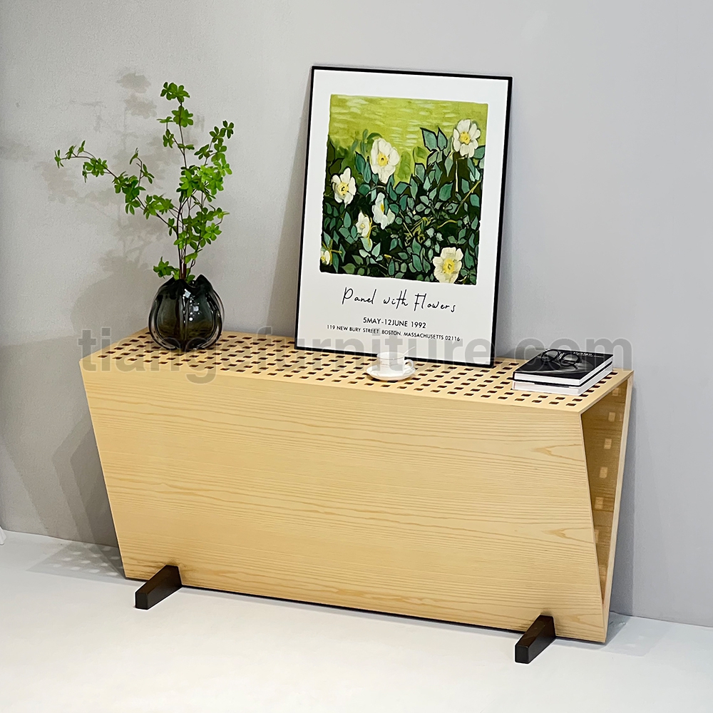 Triangular console with supporting structure in 8 mm thick steel sheet painted with epoxy powders in burnished colour; panels in 20 mm thick MDF veneered in oak, with top consisting of 20x20 mm section elements of solid oak set in a grating shape, enclosed by a 50x20 mm section perimeter frame, all in solid oak. Wood parts in oak. Support on the floor guaranteed by thermoplastic material supports.