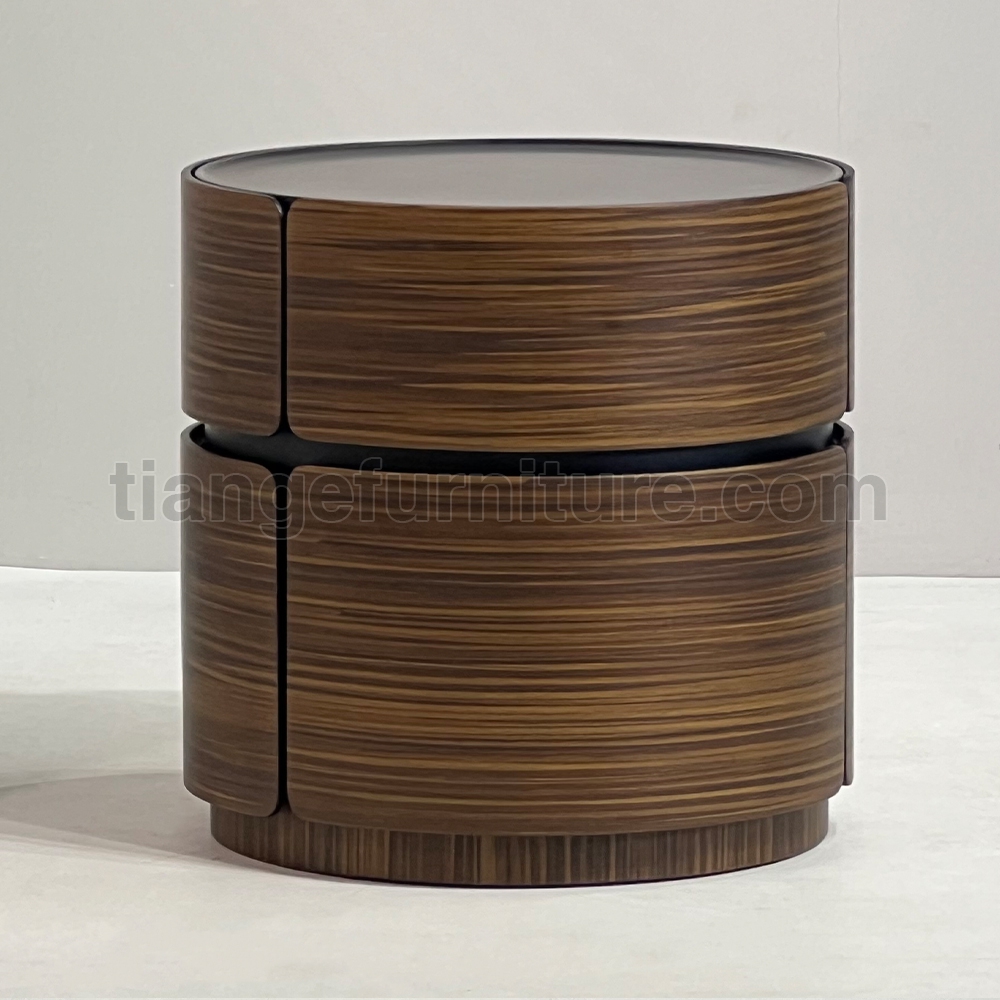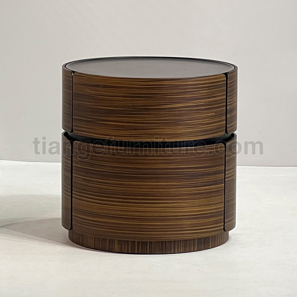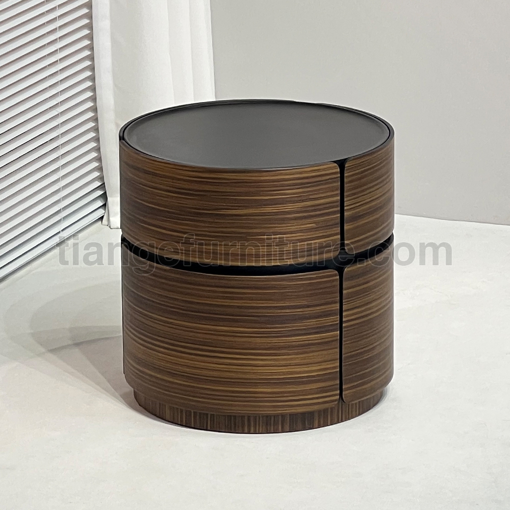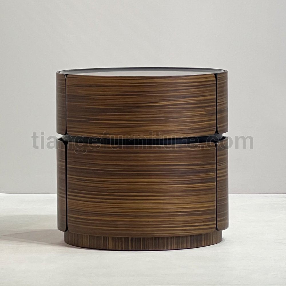 Round nightstand with 2 drawers and plinth base, total extraction drawers as standard. Available in wood and glossy lacquer, with glossy marble tops available in Emperador, Gioia di Carrara and Grafite. Made in Italy.