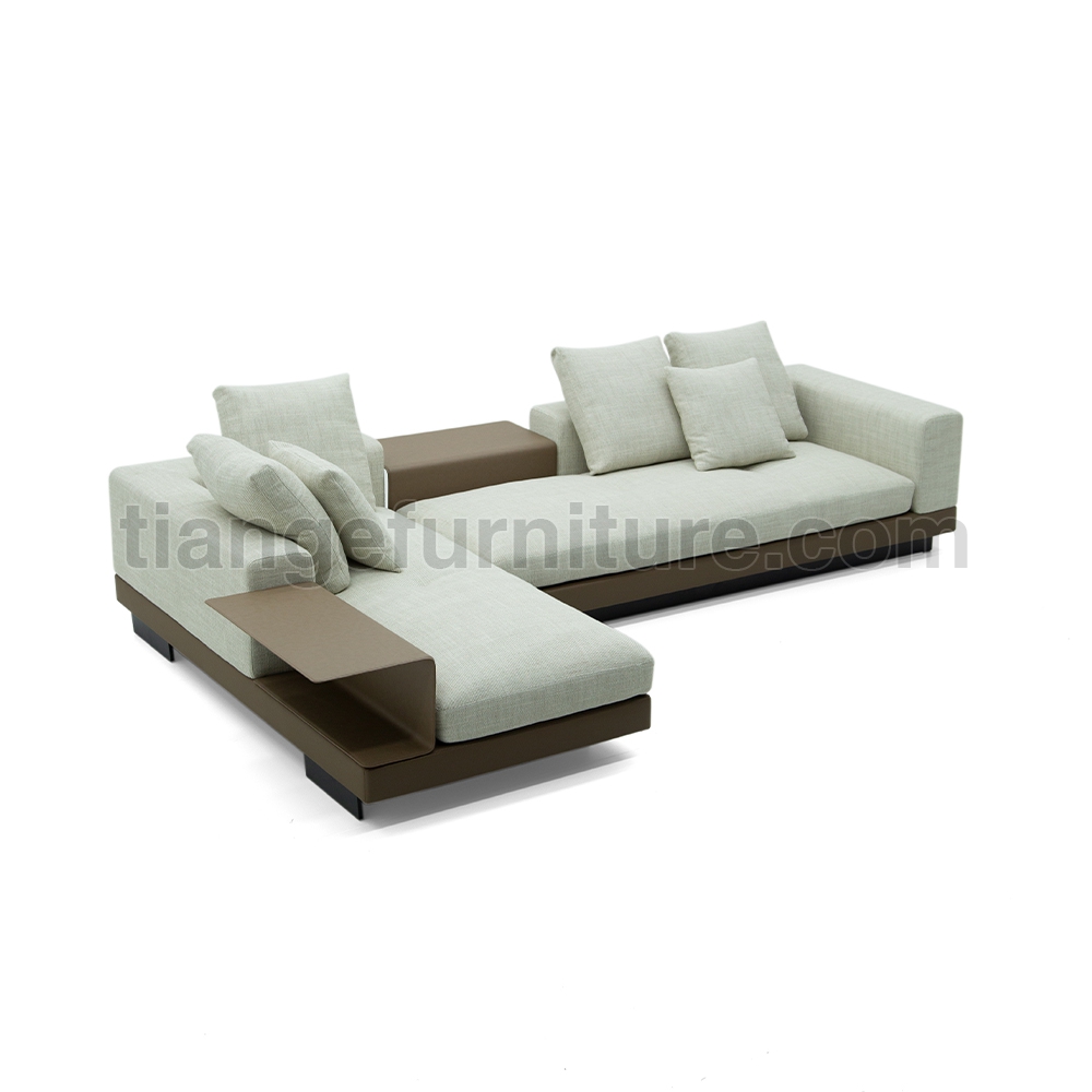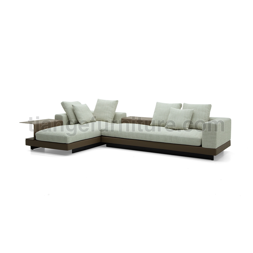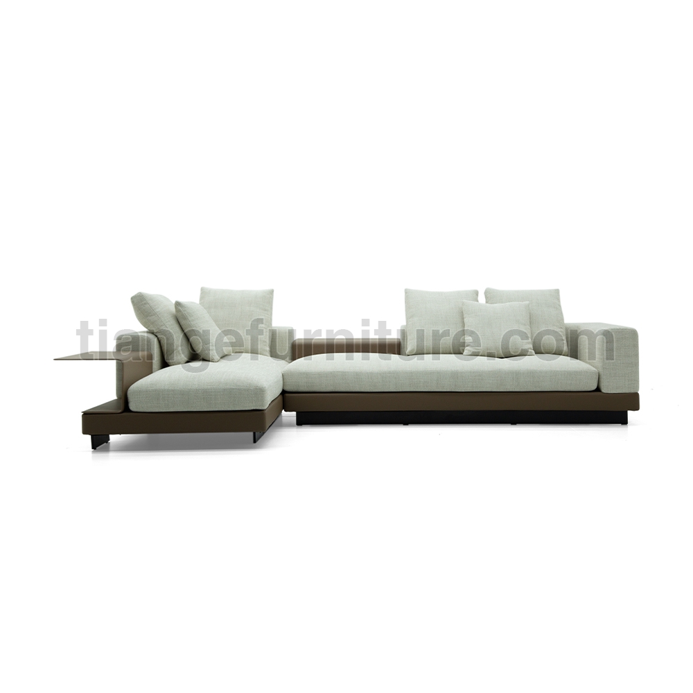 The structural base is raised from the ground on thin blades in extruded aluminium in a Brandy polished varnished finish, positioned at the front, giving the sofa an appealing and airy look, and recalling the metal parts of trunks and suitcases.