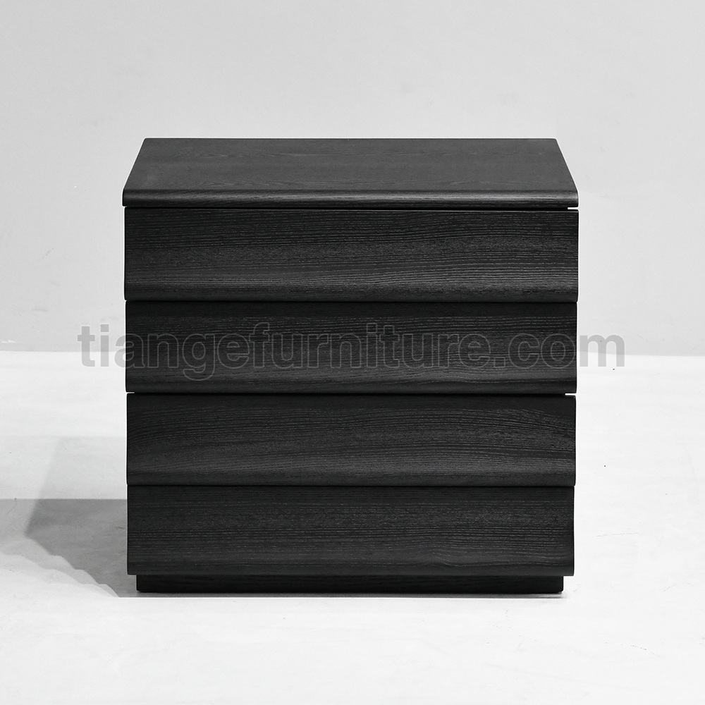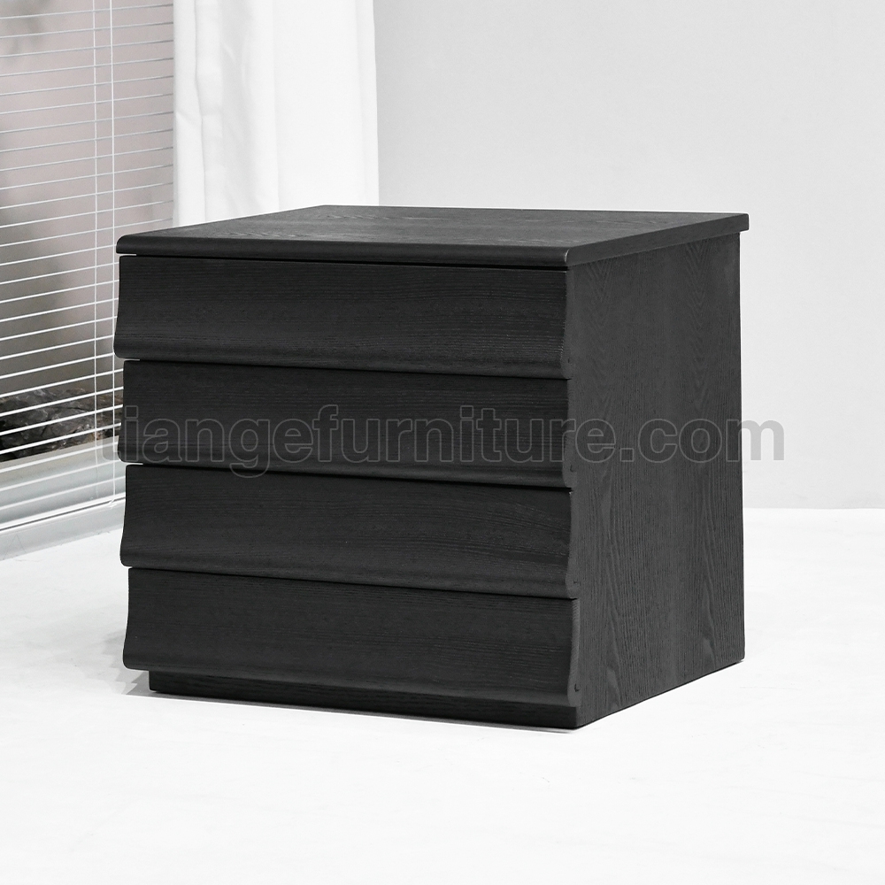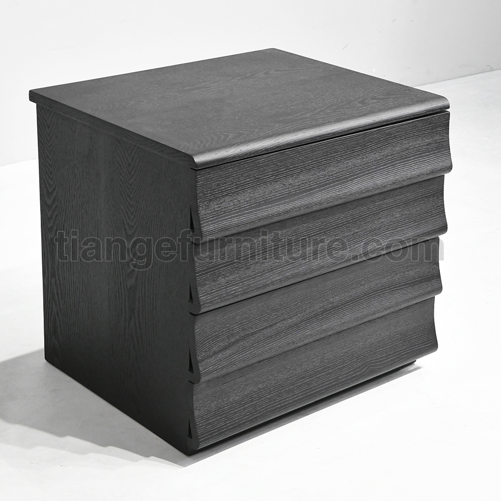 Rideaux is a collection of bedroom storage furniture defined by undulating surfaces that echo the sinuous design of Roman blinds, with their succession of curves. The family consists of a floor-standing bedside tables, a seven drawers chest, chest of 5 drawers, distinguished by the soft sequence of wooden draperies that characterize their fronts: starting from the top, this delicate wavy motif hides the edges and envelops the volumes of the furniture, before gently cascading onto the front with a slight lateral projection that creates a refined aesthetic detail, functional for drawer opening. Rideaux family is made of ash wood and available in various color variants obtained from natural pigments applied manually to the structure and then fixed with a specific beeswax.